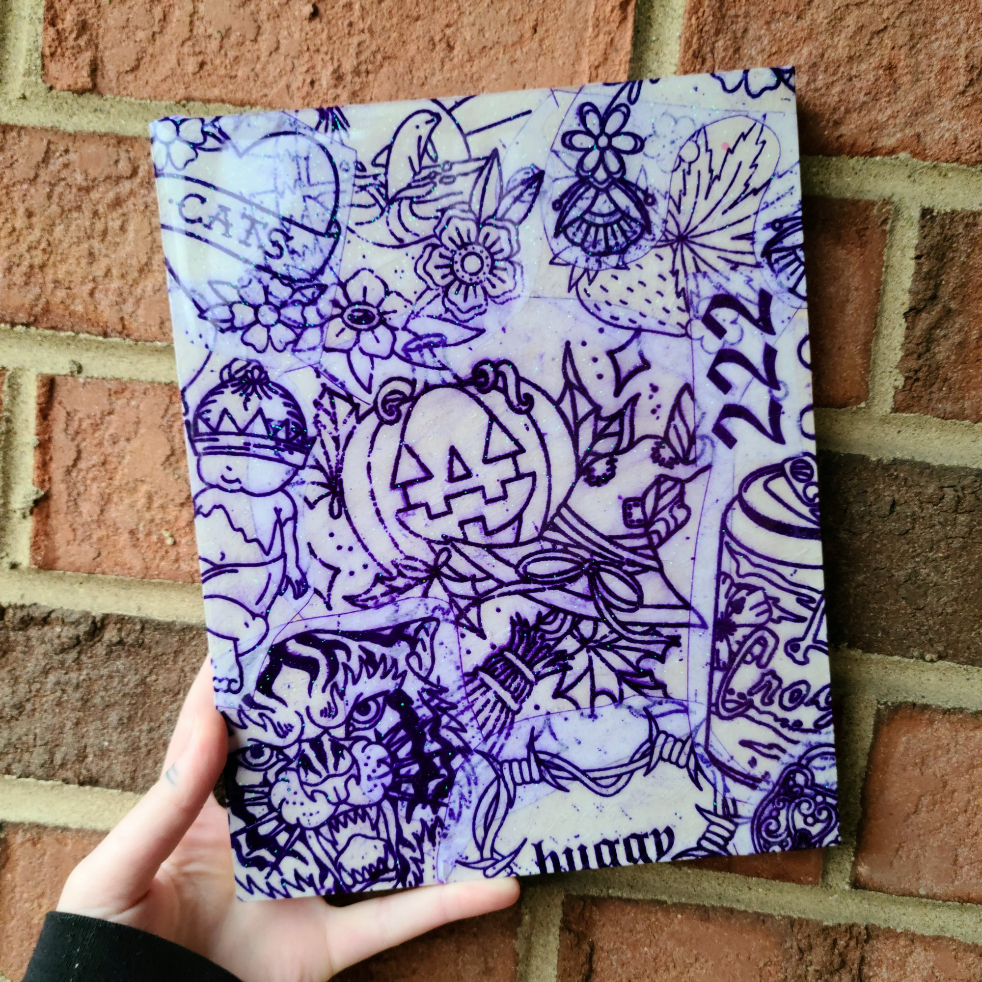 This is a 8x10", resin coated wood plaque with wall hanging backing. The stencils included are the real stencils that were used for tattoos!