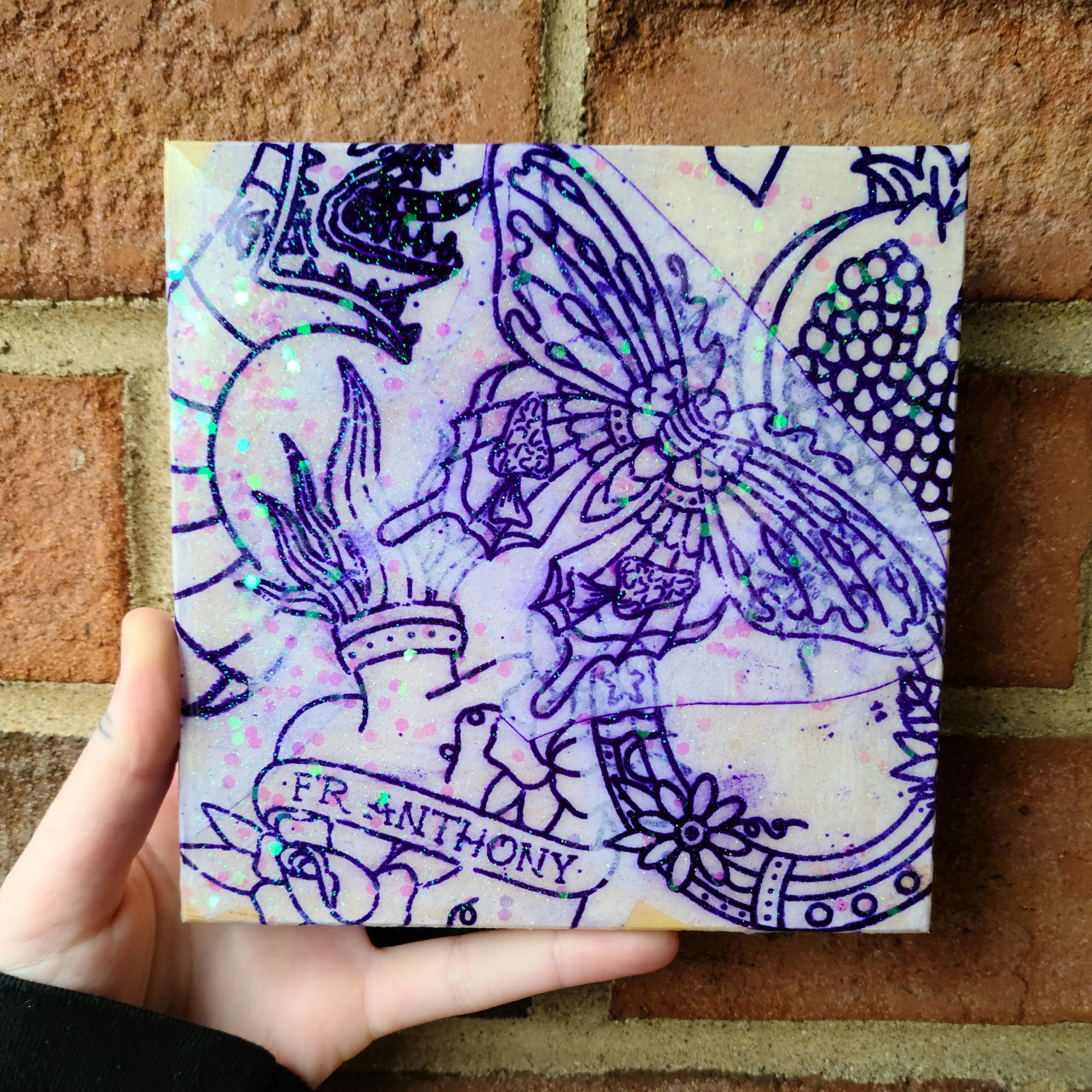 This is a 6x6", resin coated wood plaque with wall hanging backing. The stencils included are the real stencils that were used for tattoos!